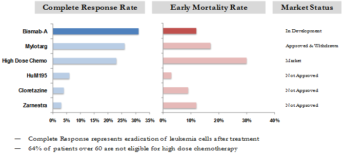 Comparison of safety and efficacy data of Bismab-A to approved products and others under development in similar patient populations (relapsed/poor cytogenetics/secondary AML patients over 60 years of age) is presented in Figure 5 below. The data indicate that the Company’s lead product candidate has efficacy similar to approved products and superior to pipeline products, but at the same time has a better side effect profile than approved products and therefore could provide treatment to patients currently ineligible for treatment with approved products.